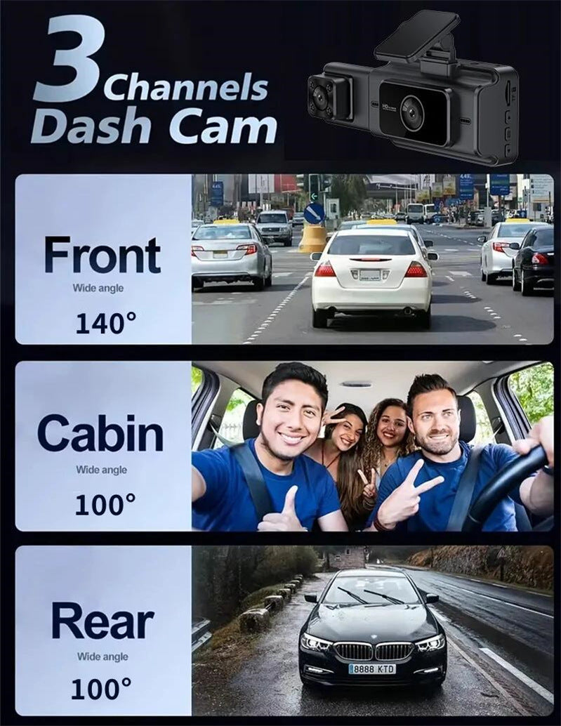 Drive with confidence and protect your vehicle 24/7 with this advanced 3-Channel Dash Cam. Designed to capture footage from the front (140°), cabin (100°), and rear (100°), it delivers crystal-clear 1080P Full HD video in all lighting conditions thanks to built-in Wide Dynamic Range (WDR) and F2.0 Night Vision.